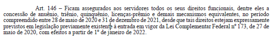 Uma notícia importante é que a Lei sancionada traz no artigo 146 a retomada da contagem de tempo para férias prêmio, quinquênios e outros benefícios dos servidores públicos mineiros, interrompida no período da pandemia pela Lei Complementar 173/2020.