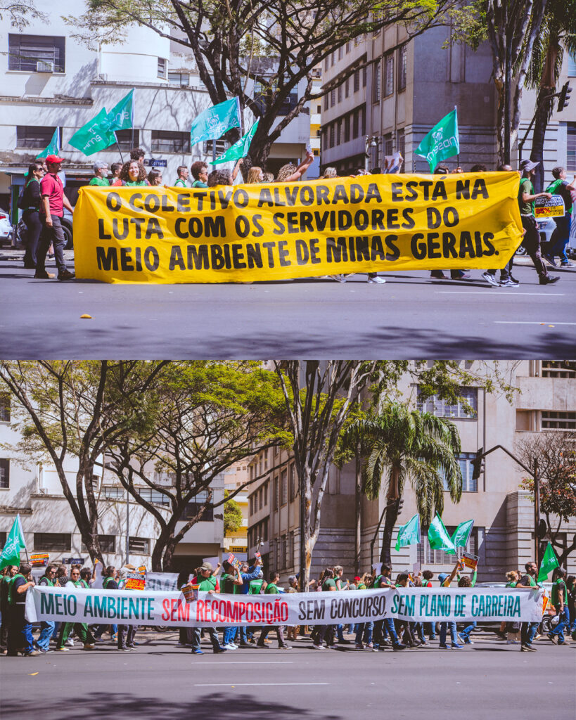Durante o trajeto, servidores realizaram panfletagens e conversaram com a população, apresentando as pautas da greve e alertando sobre o desmonte do sistema ambiental mineiro.