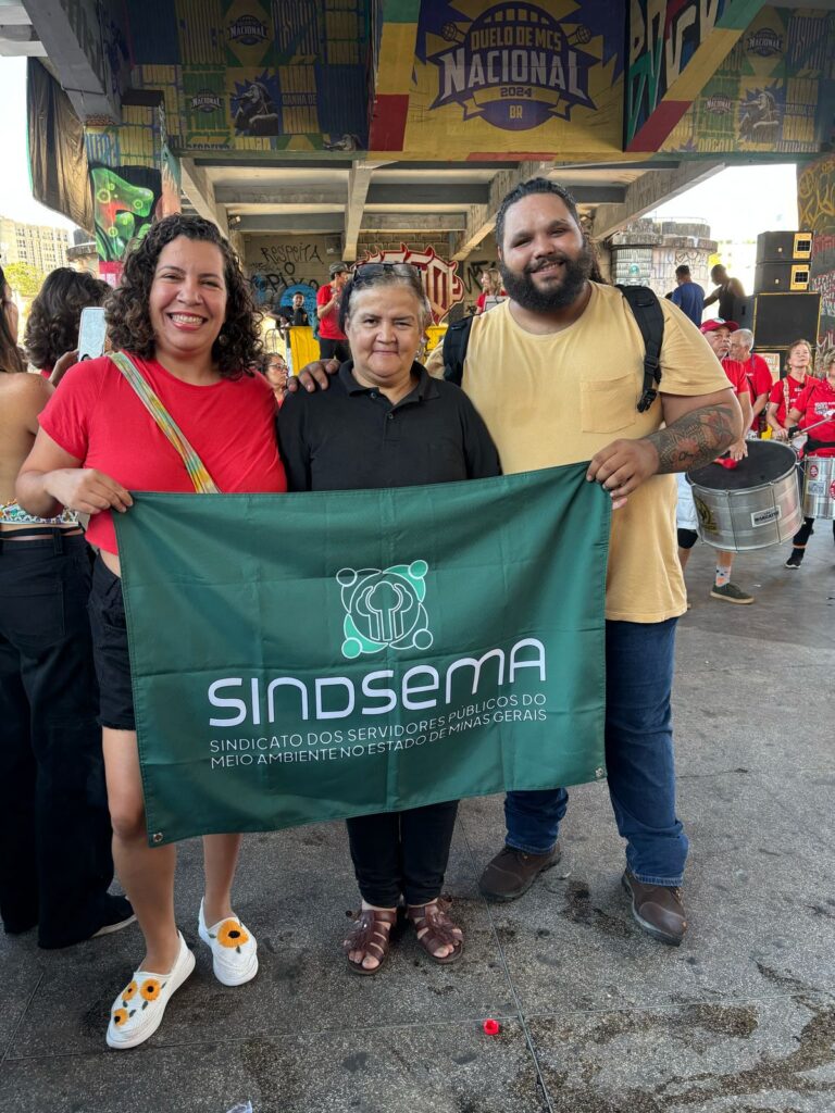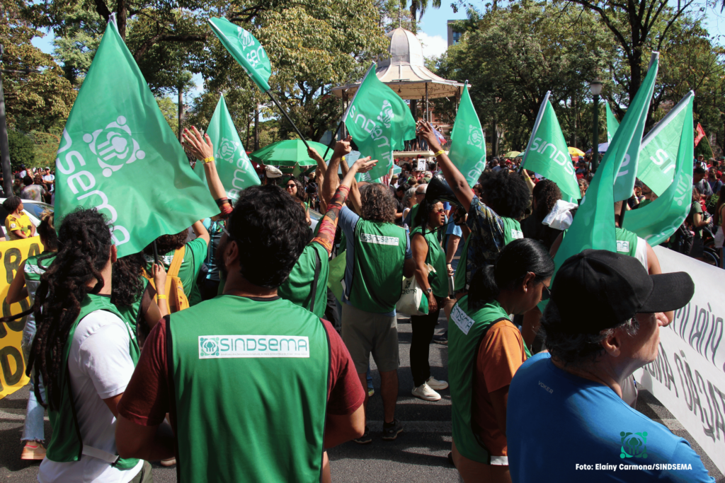 O Sindsema iniciou o mês de Maio na luta! Wallace Alves, Lara Fonseca e Sandra Baldez, membros da diretoria executiva, participaram do Ato do Dia do Trabalhador, em Belo Horizonte.